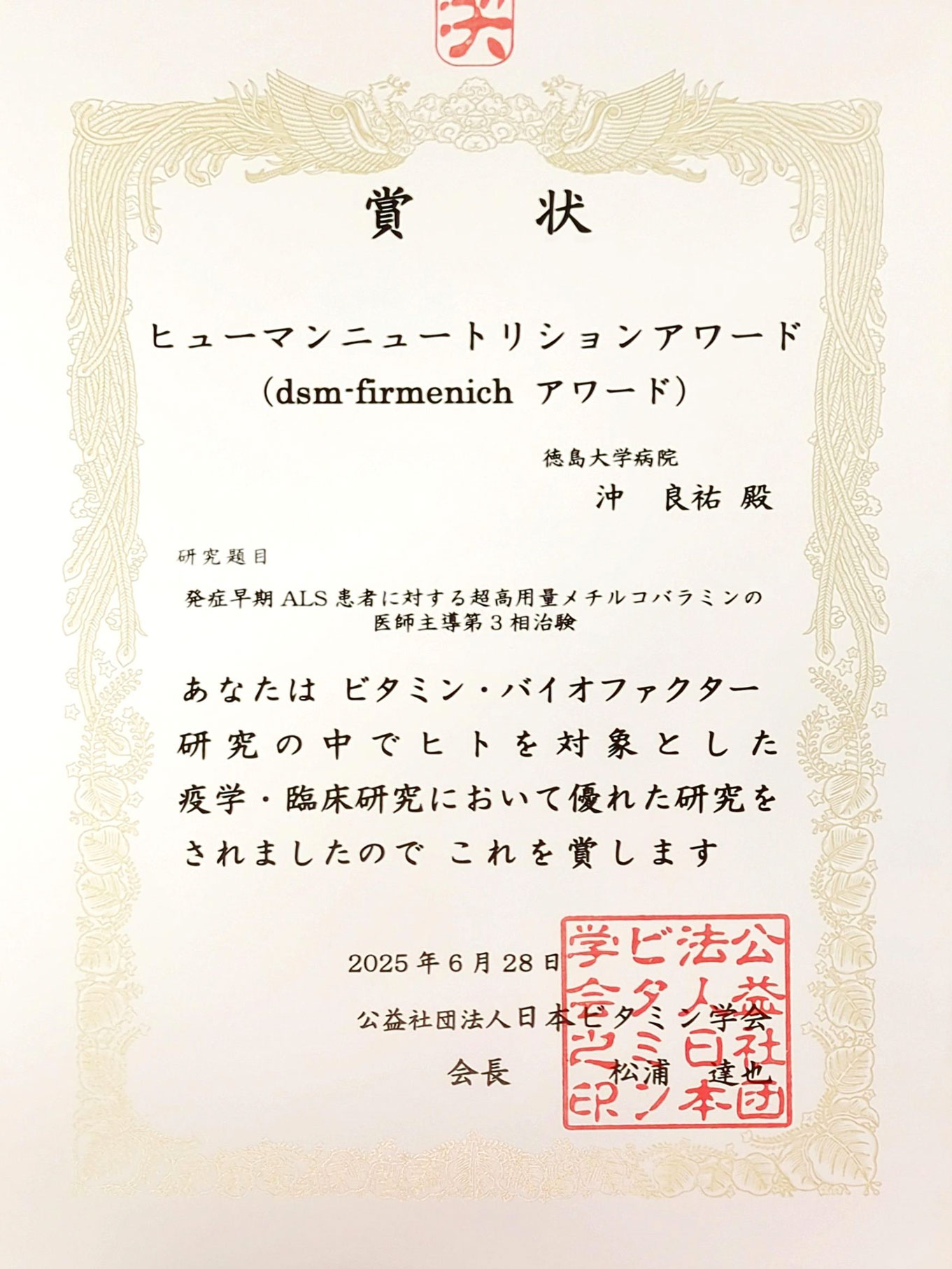当科 沖 良祐 医師が、 「発症早期ALS患者に対する超高用量メチルコバラミンの医師主導第3相治験」について、日本ビタミン学会でヒューマンニュートリションアワードを受賞しました。