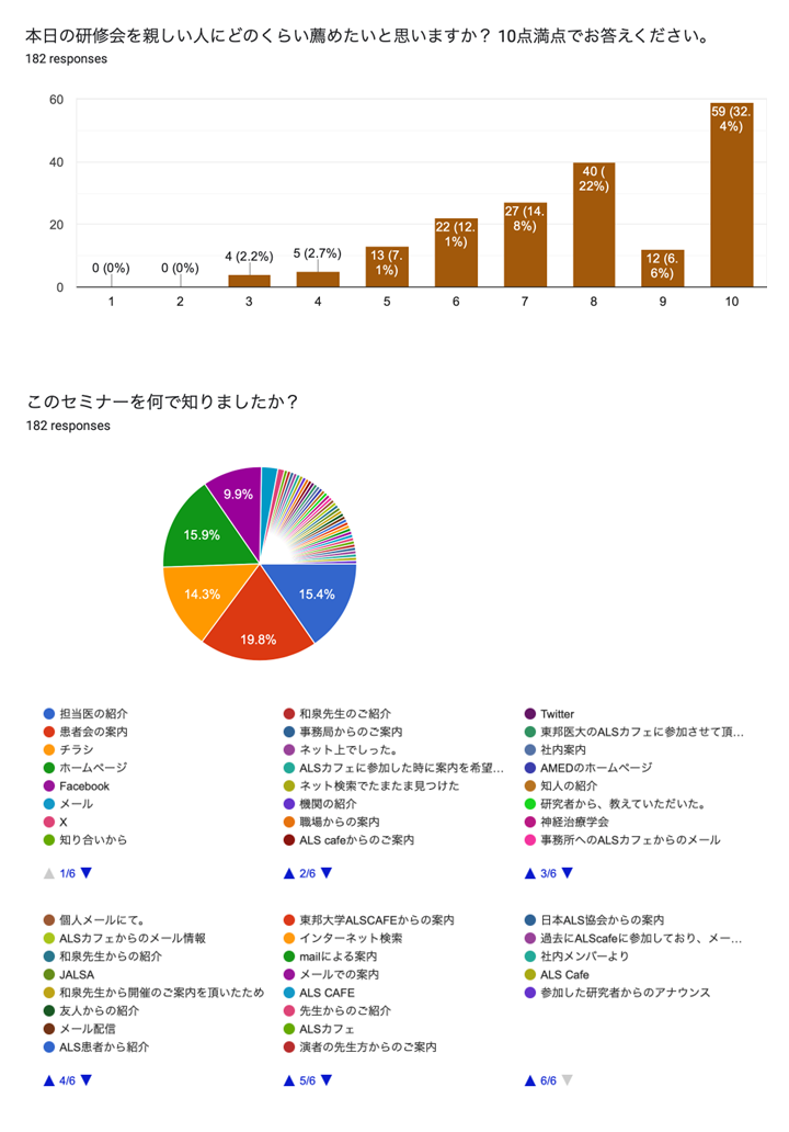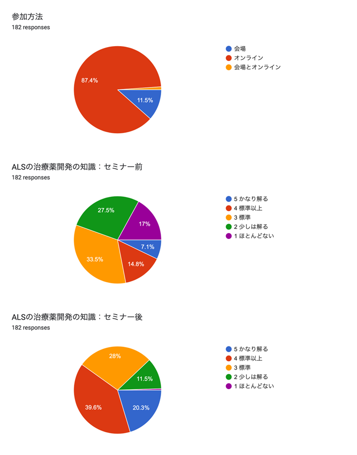 • 自身がALSを罹病しておりますが、多くの方々が関わられ、このようなセミナーを実施いただいたことに深く感謝を申し上げます。日頃、なかなかALSに関する情報も得ることは難しく、詳細を知り得る機会も少ないので是非、定期的に情報提供いただけることを願っております。