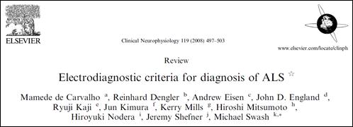 ALSの診断は臨床診断が中心ですが、筋萎縮が明らかでない早期例や限局例を中心に筋電図が診断の重要な要素となっています。ALSの電気診断基準として改定El Escorial基準が使用されてきていますが、早期ALSでの検査感度の低さが問題となっておりより有用な基準の制定が課題となっていました。そこで徳島大学神経内科が淡路島で国際シンポジウムを開催し、世界各国からALSの有名研究者を招いて新基準を制定しました(Awaji criteria(淡路基準))。2008年にだされたこの基準はすでに100本ほどの論文に引用されるほど受け入れられ、新しい世界標準基準として認められてきました。淡路基準を実際の患者さんに適応した論文は世界中から報告されていますが、我々の研究室からも咽頭部初発型の診断に有用であること、淡路基準が改定El Escorial基準より数か月早期に診断可能であることを報告しました(Okita, 2011)。様々な視点から淡路基準の有用性を現在も検討中です。