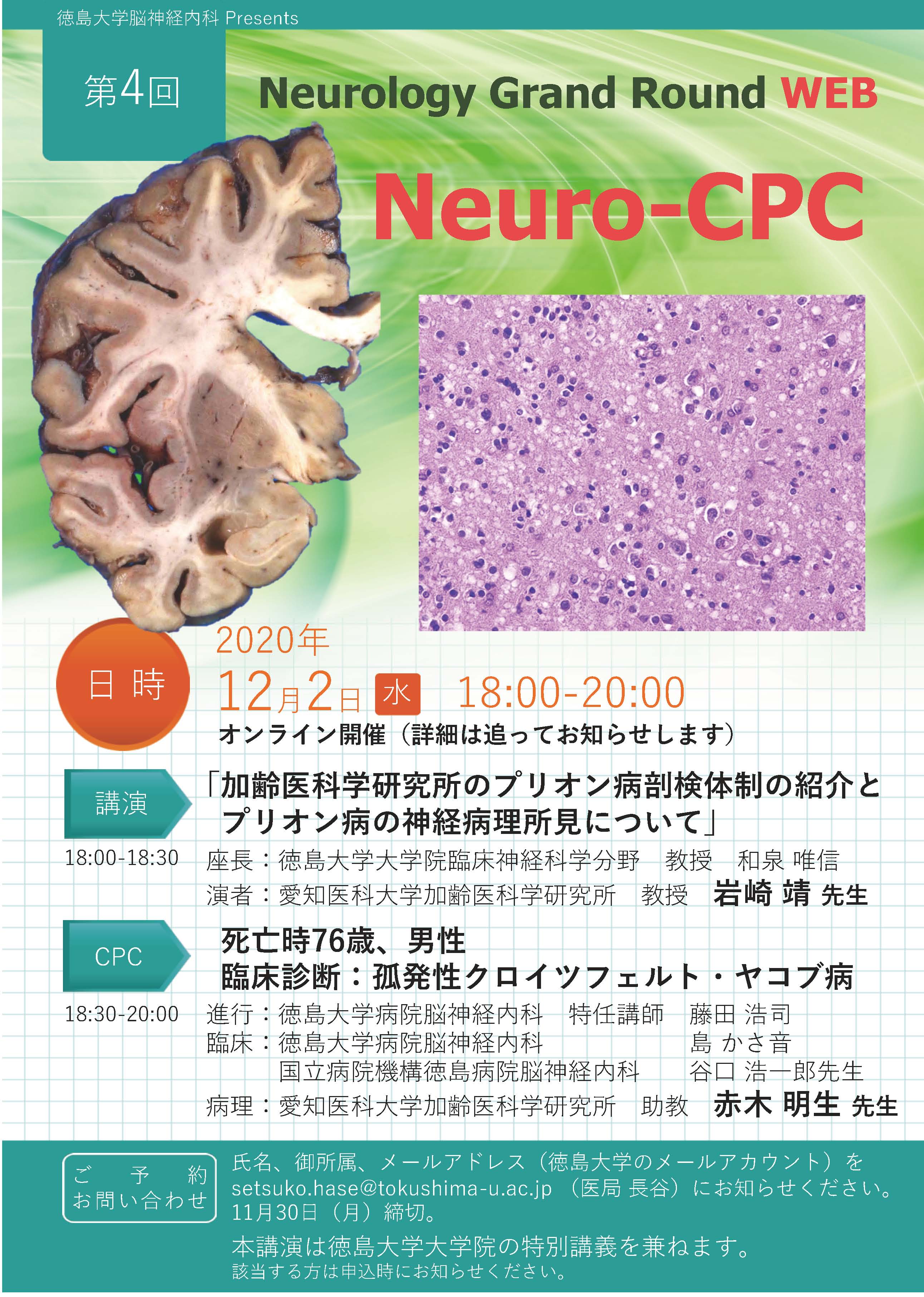 氏名、御所属、メールアドレスを setsuko.hase@tokushima-u.ac.jp (医局 長谷)にお知らせください。 11月30日(月)締切。
