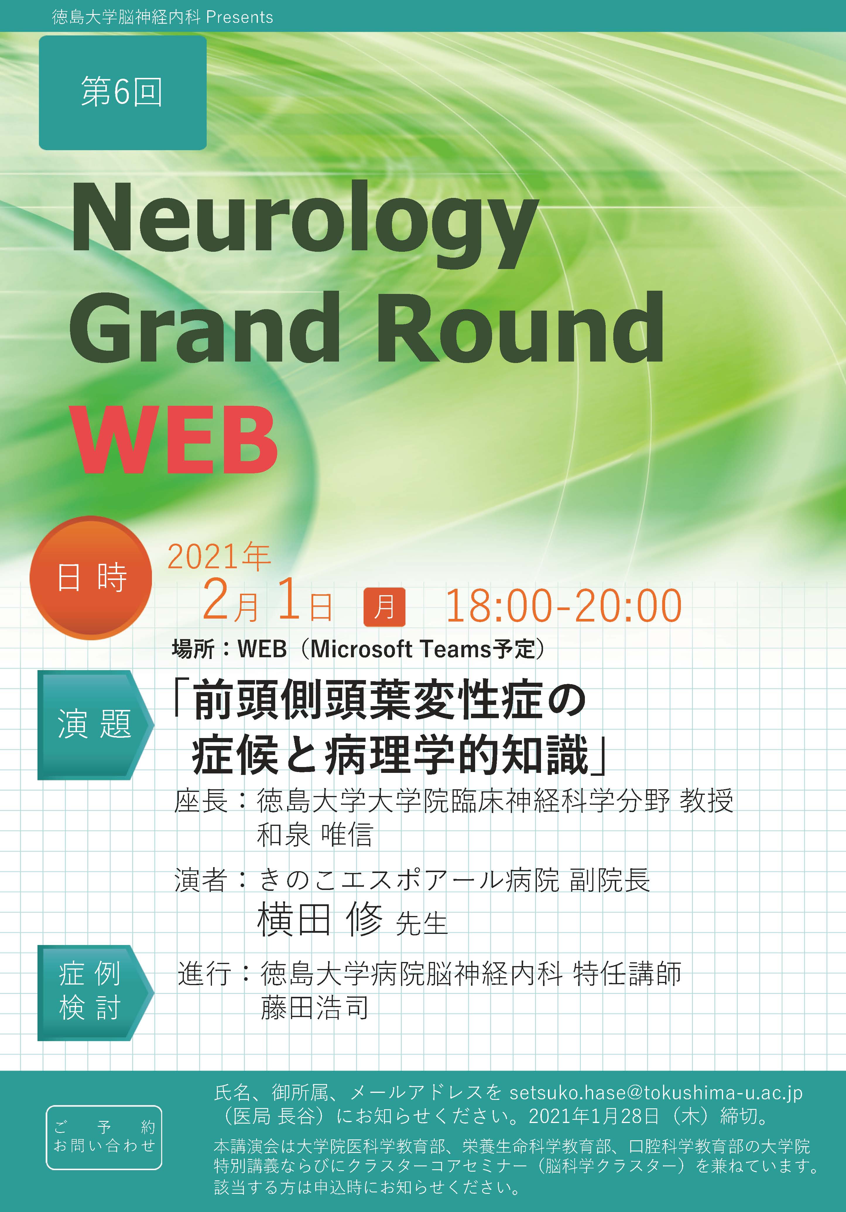 氏名、御所属、メールアドレスを setsuko.hase@tokushima-u.ac.jp (医局 長谷)にお知らせください。 2021年1月28日(木)締切。