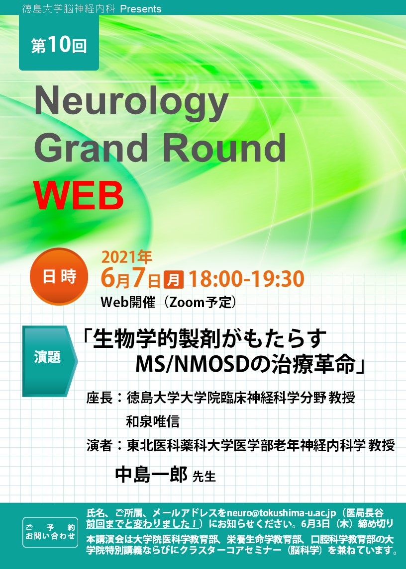 氏名、御所属、メールアドレスを neuro@tokushima-u.ac.jp (医局 長谷)にお知らせください。 2021年6月3日(木)締切。