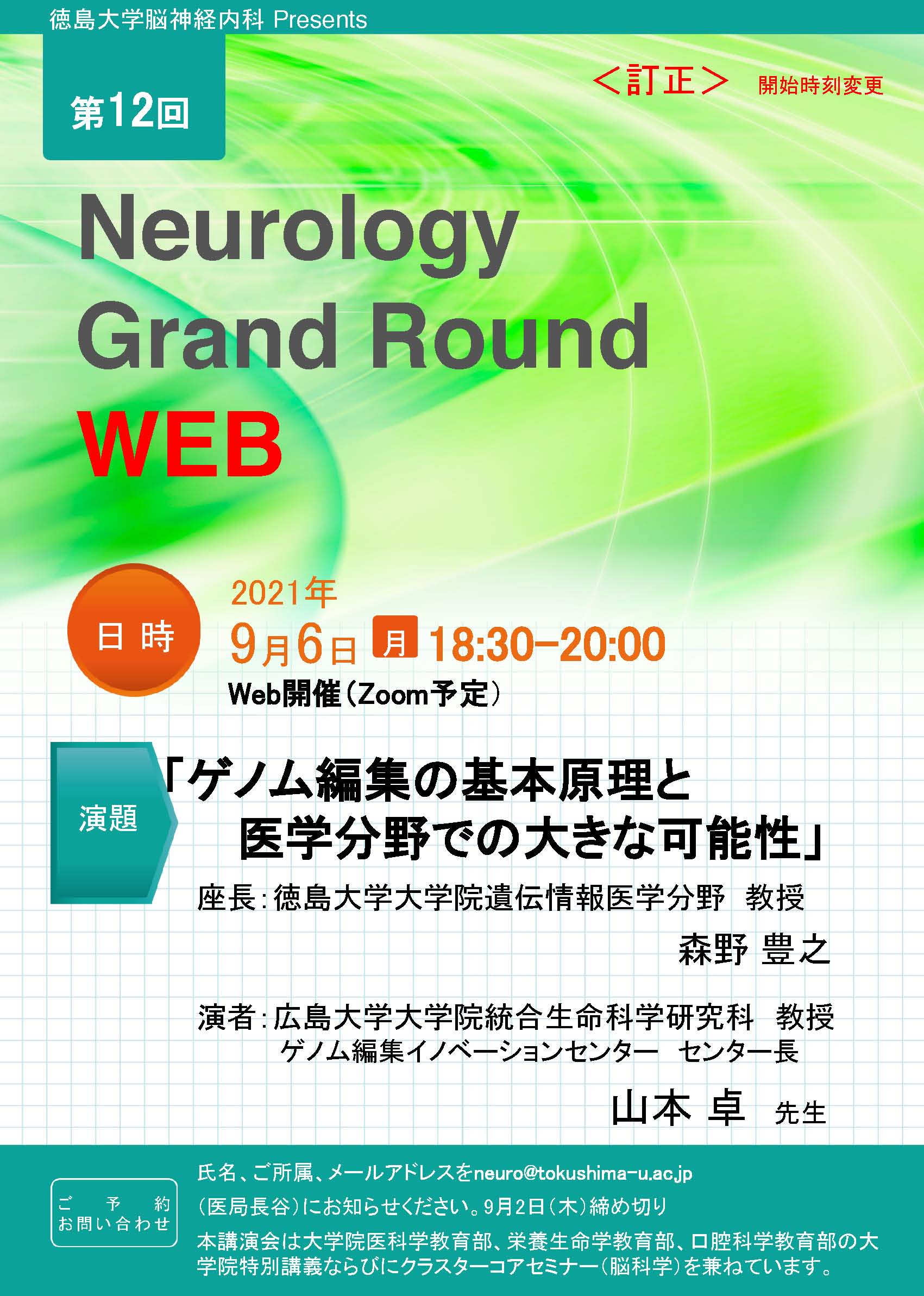 氏名、御所属、メールアドレスを neuro@tokushima-u.ac.jp (医局 長谷)にお知らせください。 2021年9月2日(木)締切。