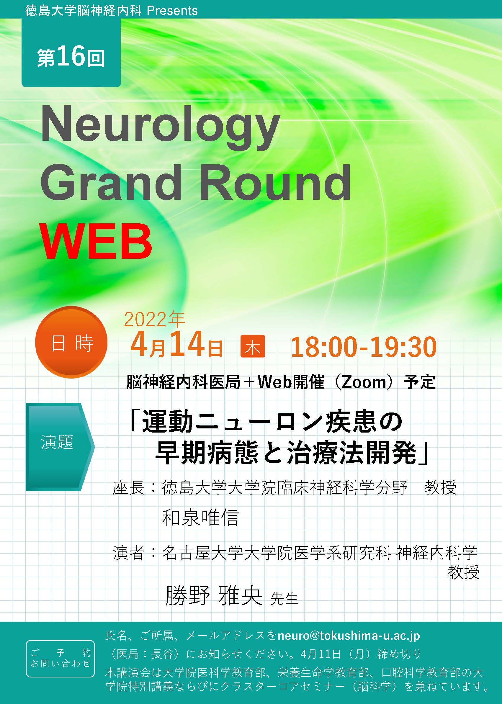 氏名、御所属、メールアドレスを neuro@tokushima-u.ac.jp (医局 長谷)にお知らせください。 2022年4月11日(月)締め切り。