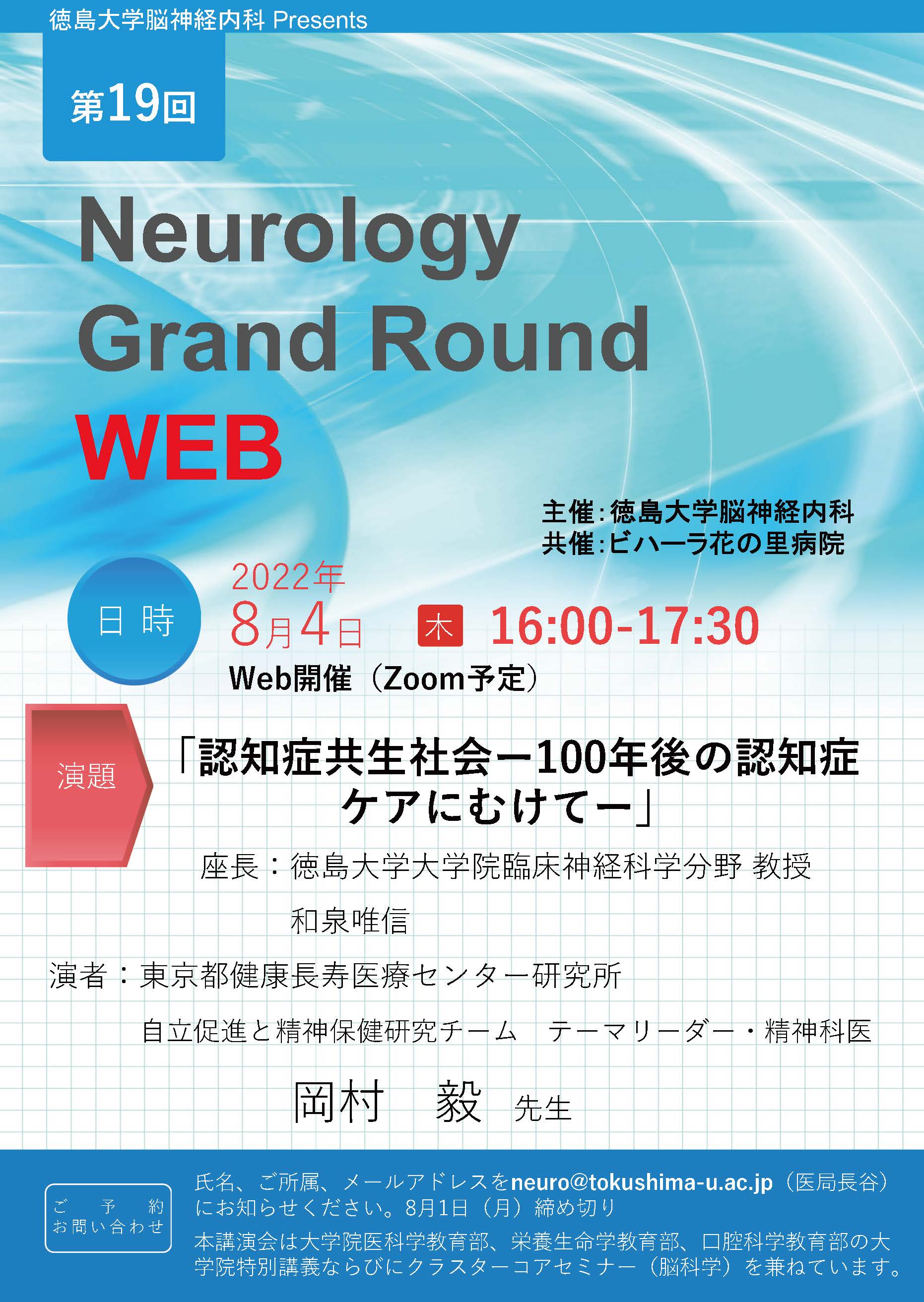 氏名、御所属、メールアドレスを neuro@tokushima-u.ac.jp (医局 長谷)にお知らせください。 2022年8月1日(月)締め切り。