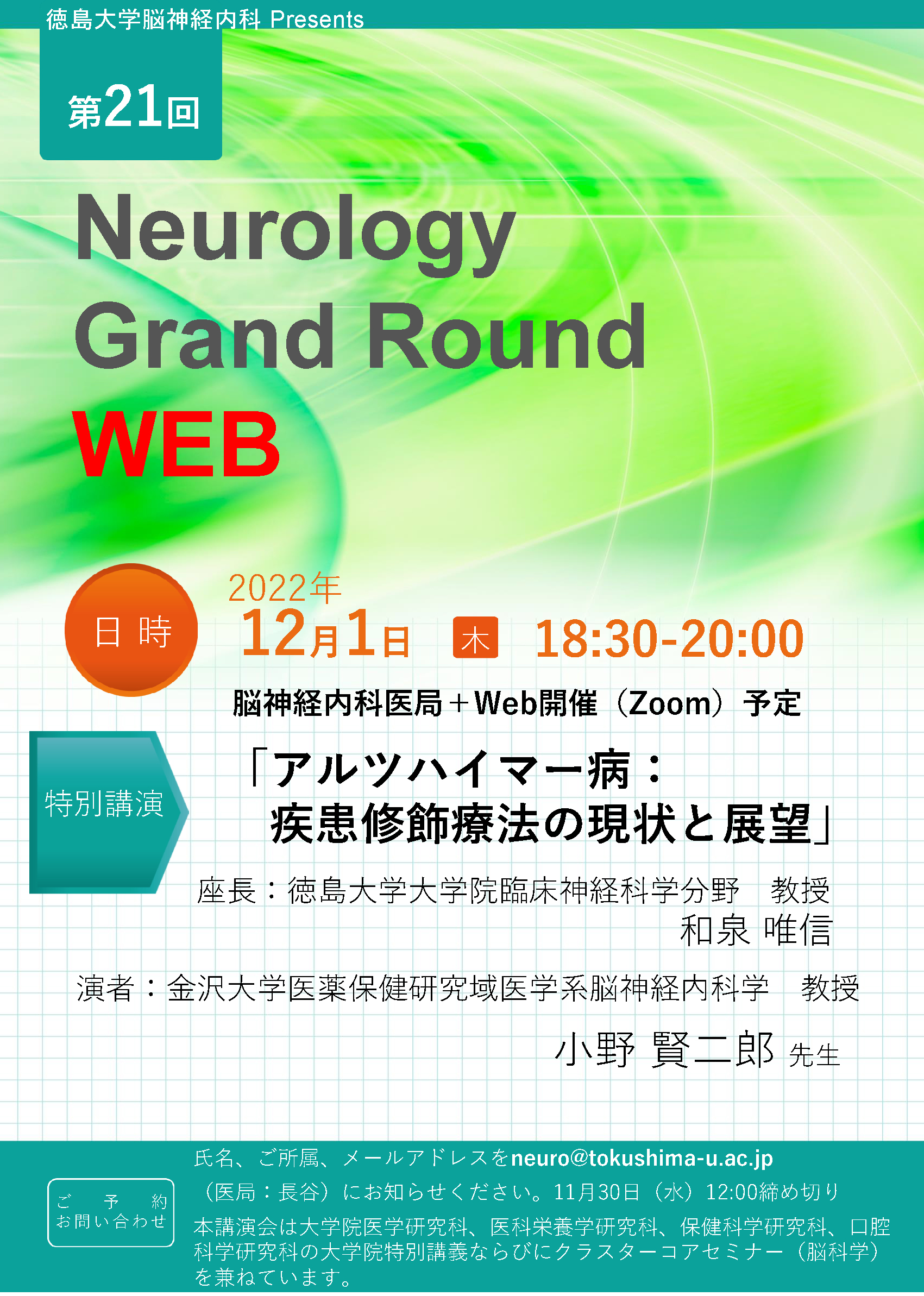 氏名、御所属、メールアドレスを neuro@tokushima-u.ac.jp (医局 長谷)にお知らせください。 2022年11月30日(水)締め切り。