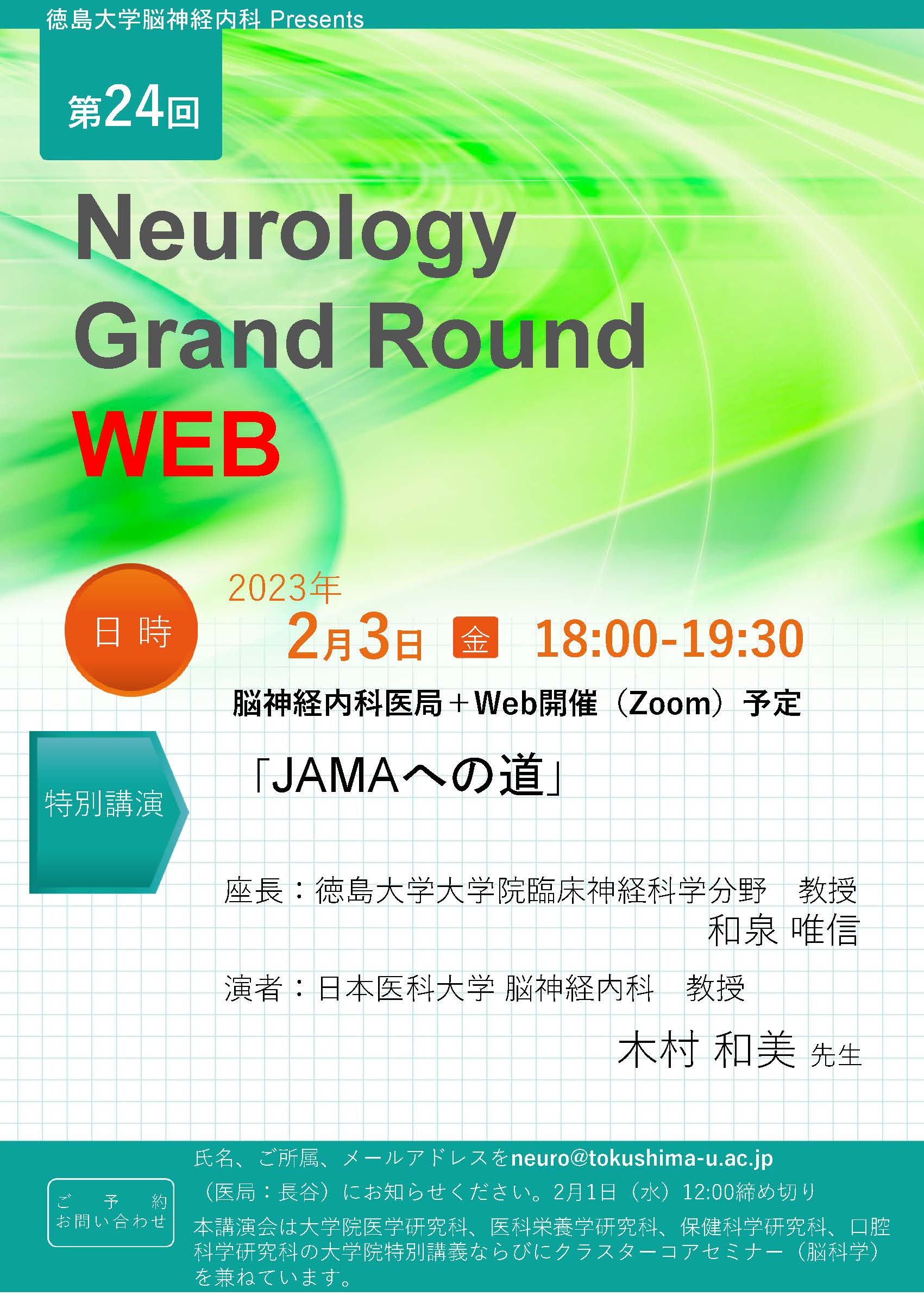 氏名、御所属、メールアドレスを neuro@tokushima-u.ac.jp (医局 長谷)にお知らせください。