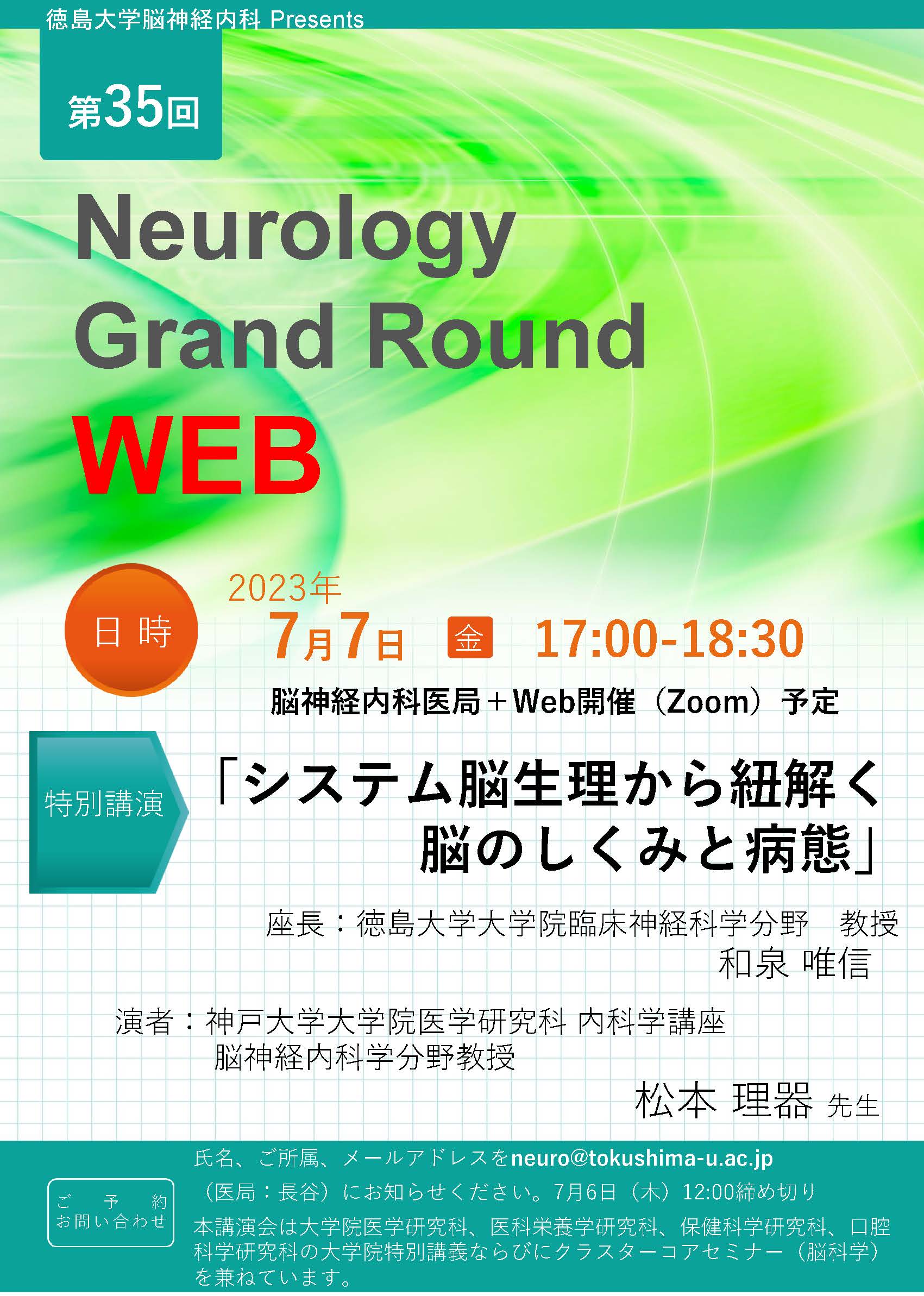 氏名、御所属、メールアドレスを neuro@tokushima-u.ac.jp (医局 長谷)にお知らせください。