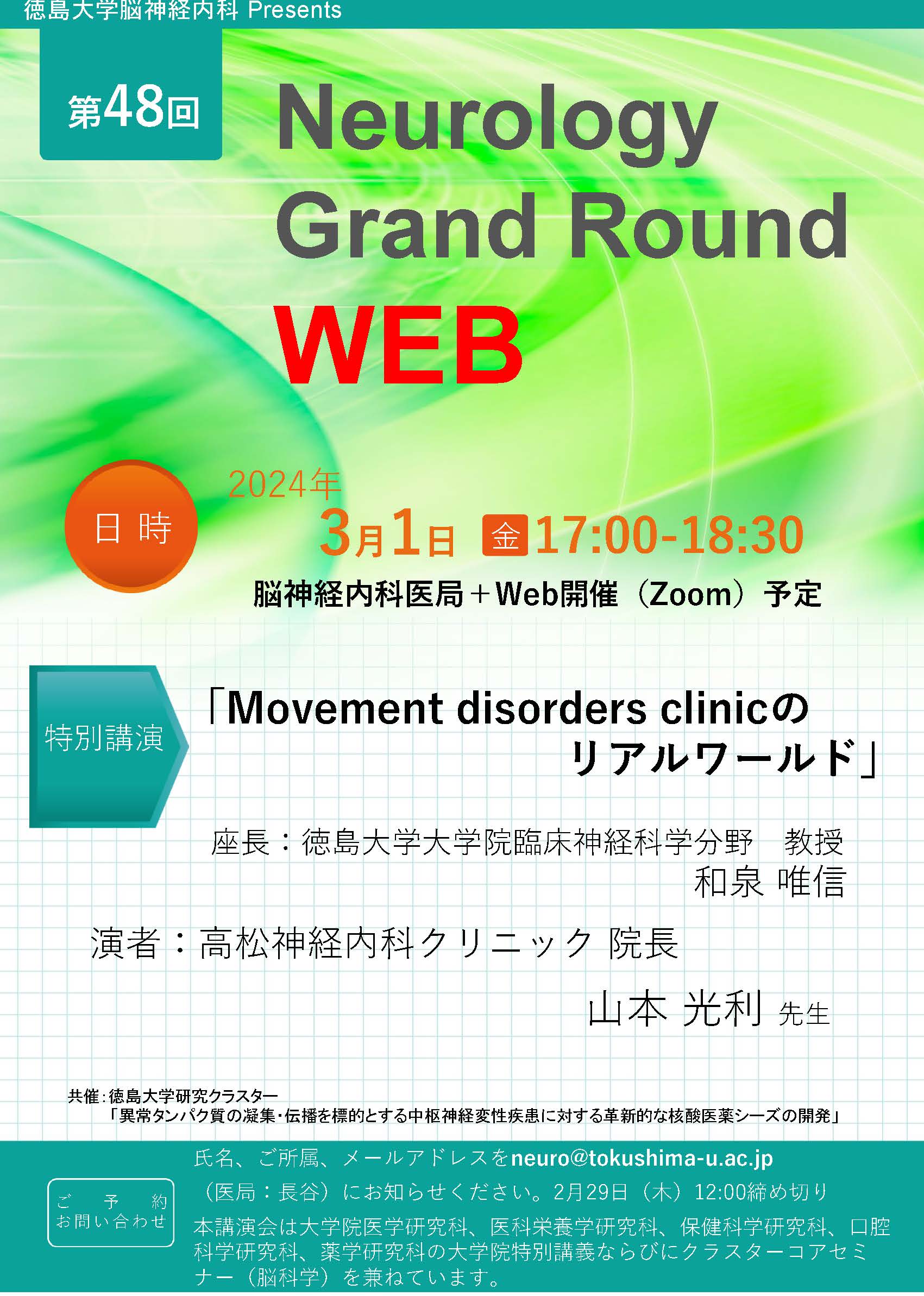 氏名、御所属、メールアドレスを neuro@tokushima-u.ac.jp (医局 長谷)にお知らせください。