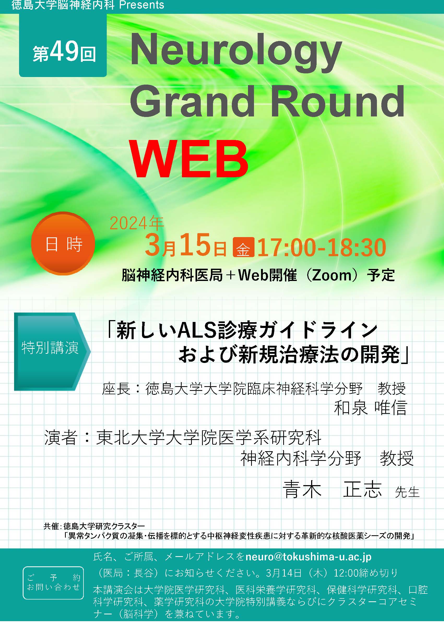 氏名、御所属、メールアドレスを neuro@tokushima-u.ac.jp (医局 長谷)にお知らせください。