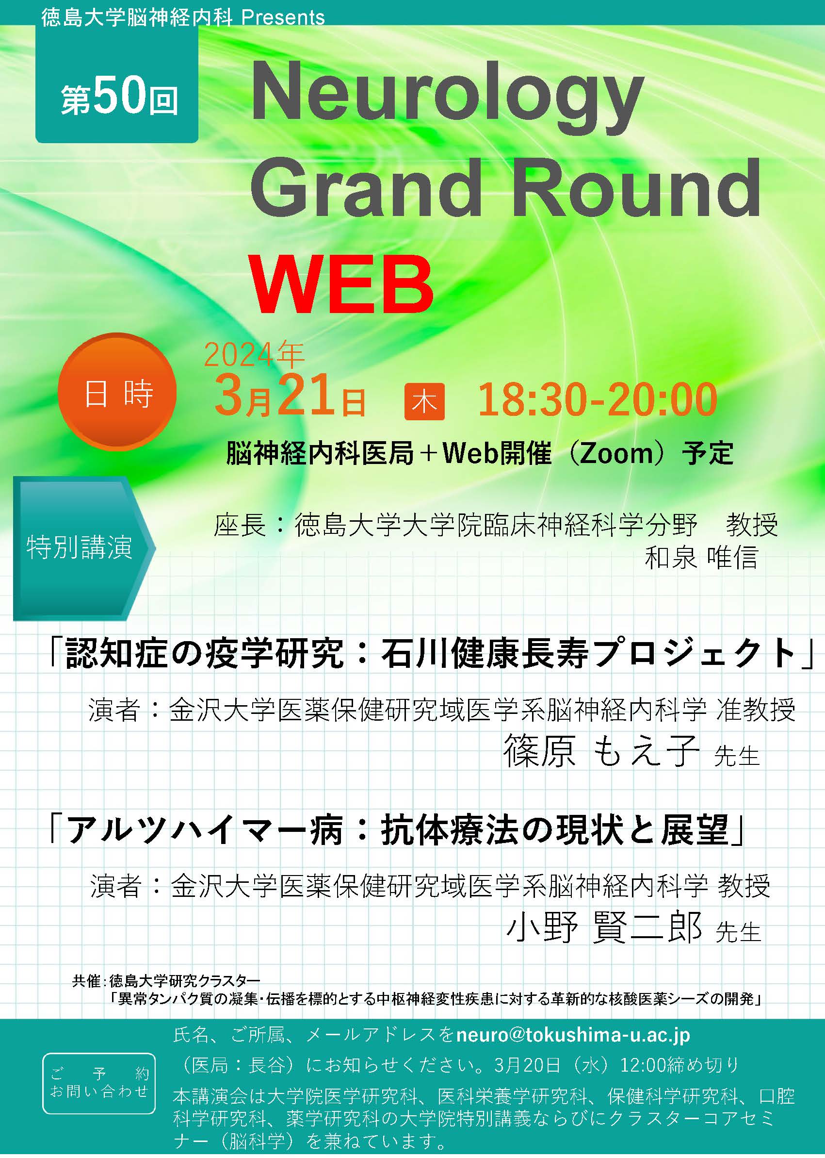 氏名、御所属、メールアドレスを neuro@tokushima-u.ac.jp (医局 長谷)にお知らせください。