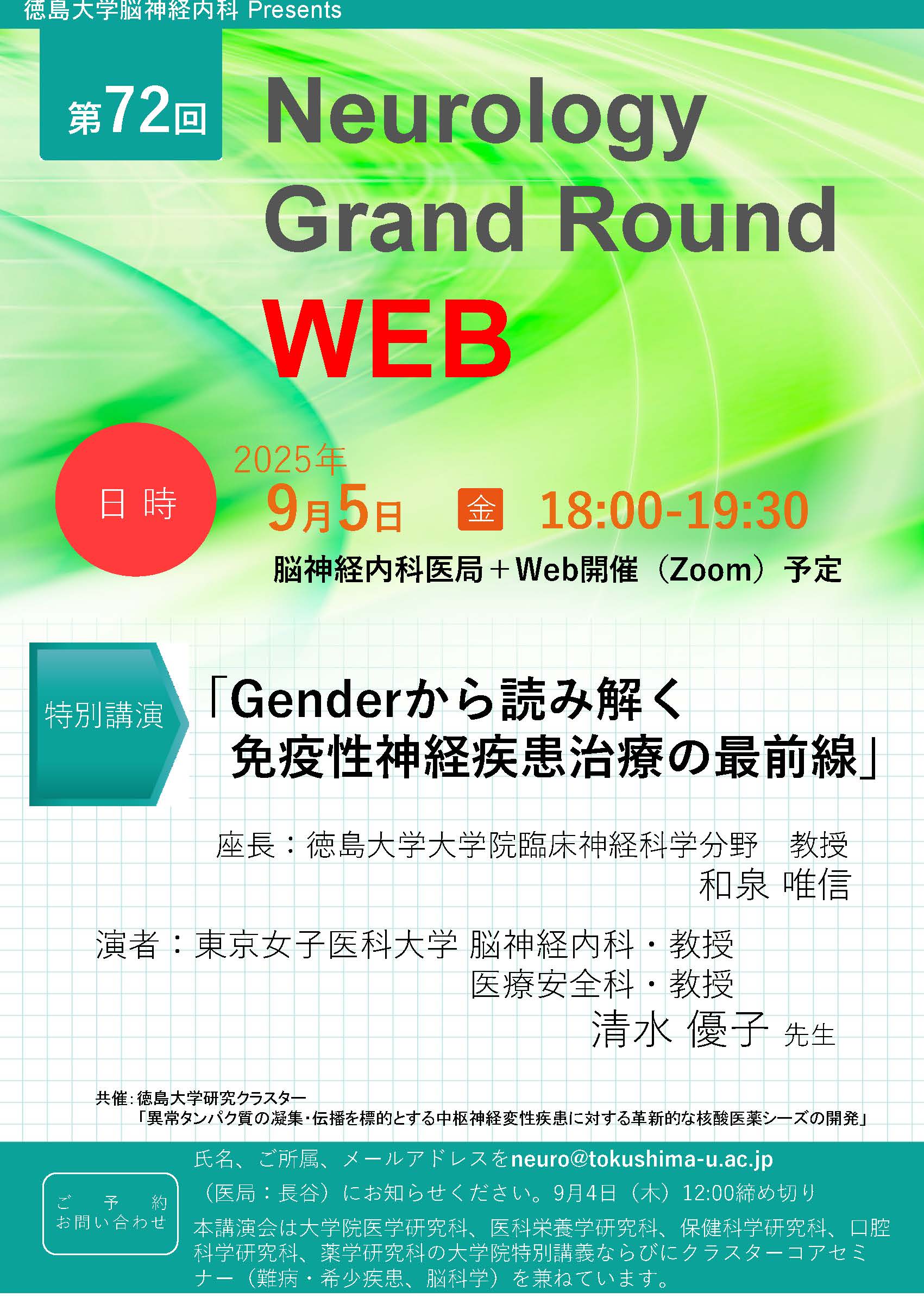 氏名、御所属、メールアドレスを neuro@tokushima-u.ac.jp (医局 長谷)にお知らせください。