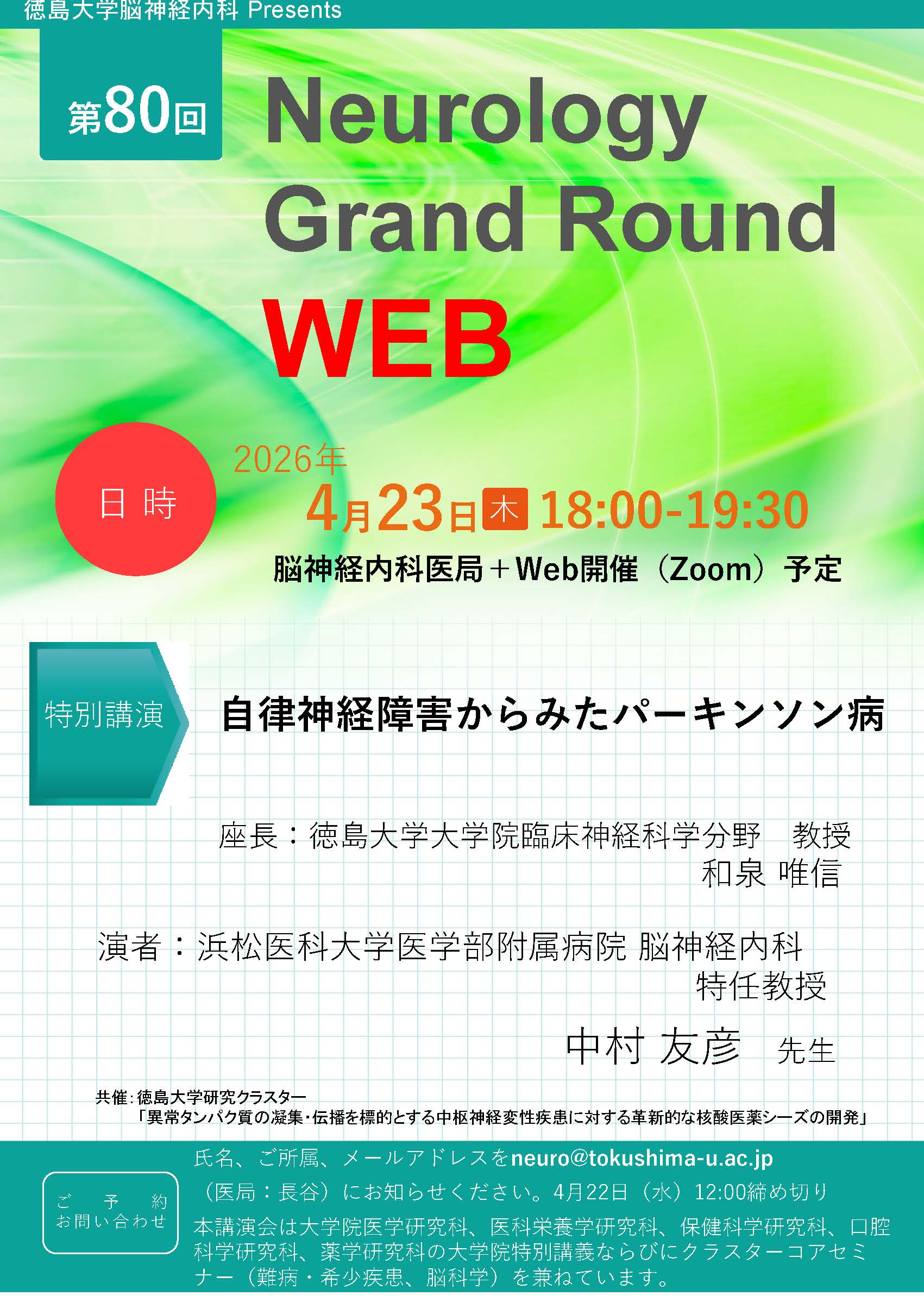 氏名、御所属、メールアドレスを neuro@tokushima-u.ac.jp (医局 長谷)にお知らせください。