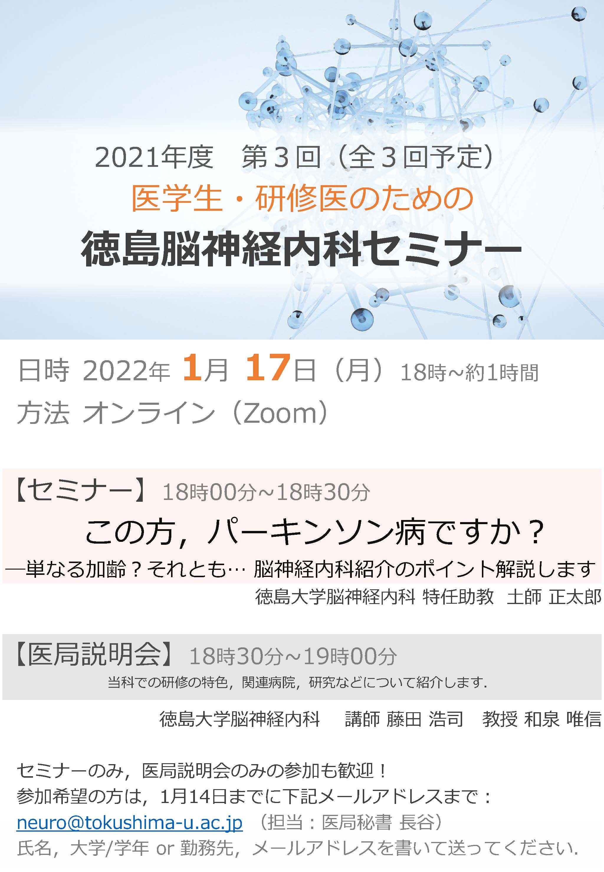 neuro@tokushima-u.ac.jp (担当:医局秘書 長谷)