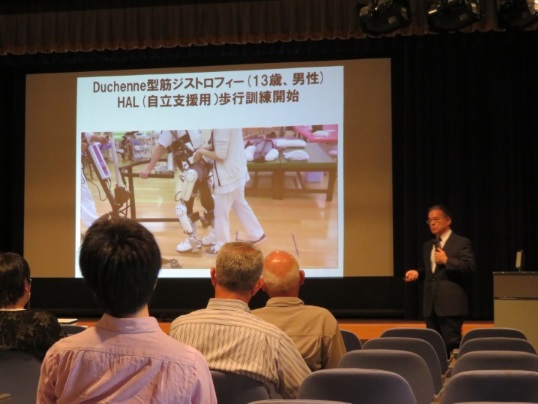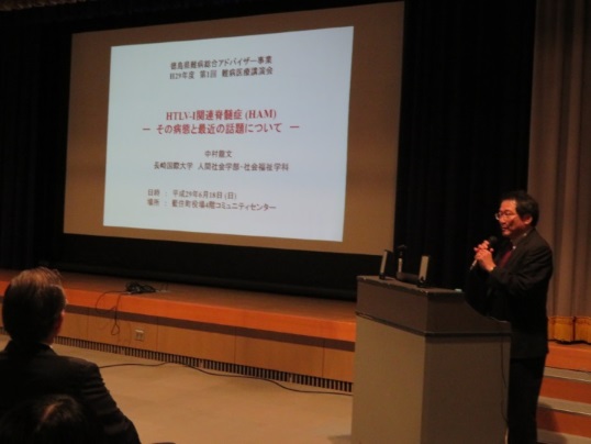 平成29年6月18日(日)に藍住町役場コミュニティセンター(町民シアター)にて、第1回難病医療講演会が開催されました。 講演会では、まず長崎国際大学 中村龍文先生からHTLV-I関連脊髄症(HAM)の病態や治療等についてわかりやすくご講演をいただきました。 また、徳島病院 高田信二郎先生からロボットリハビリを用いた臨床治験の取組みをはじめ、筋力低下をきたす患者様に対するロボットリハビリの効果等 動画を交えわかりやすくご講演いただきました。